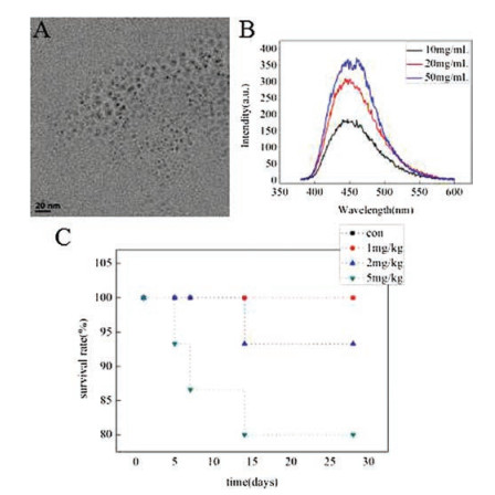 | Fig. 1. (a) The TEM images and (b) the fluorescence intensity of CDs and (c) the survival rate of mice after treated with CDs by single inhalation. | |