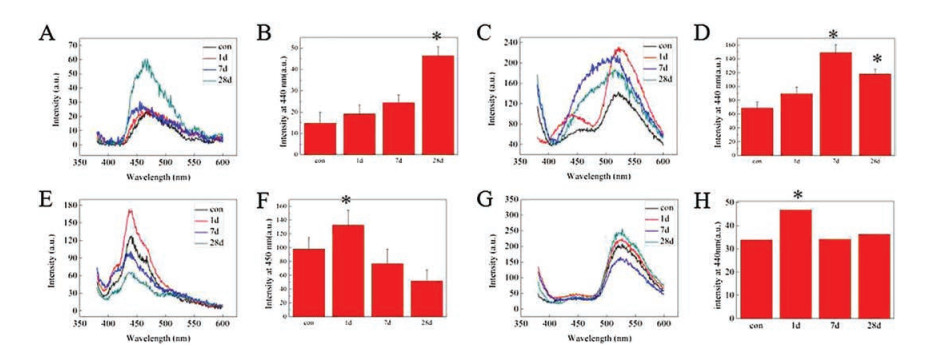 We also measured the fluorescence signal intensity of the peak at 440 nm of each tissues and shown in Fig. 3. Compared with the control group, the homogenate of lung of the mice treated 5 mg/kg CDs at the 28th day showed a strong absorption peak at about 440 nm, while there was no significant difference the group of the 1st day and the 7th day showed. The fluorescence signal intensity of the peak at 440 nm of 28 days was higher than the control group (P < 0.05). Fig. 3 showed the fluorescence emission spectrum of liver and the signal intensity at 440 nm of 7 days and 28 days were significantly increased in comparison with the control group (P < 0.05). The fluorescence emission spectrum of the homogenate of brain was shown in Fig. 3. The signal intensity at 440 nm of 1 day was significantly increased (P < 0.05). The fluorescence emission spectrum and signal intensity of the homogenate of kidney was shown in Fig. 3. Compared with the control group, it could find that there was significant increase of the signal intensity of kidney at 1 day (P < 0.05). These results of the lung and liver showed that the fluorescent intensity increase with time-dependent manner. However, the highest intensity of the brain and kidney were observed at 1 day. These results suggested that CDs located in the lung and liver for about one month and parts of CDs can eliminate from the kidney in the early period. Thus, the lung and the liver were considered as the major target organs of CDs after single inhalation exposure.