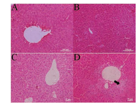 | Fig. 4. Hematoxylin and eosin stained images of the liver from control (A) and mice inhaled CDs at the concentration of 5 mg/kg at 1 day (B), 7 days (C), and 28 days (D). Black arrow indicates necrosis of hepatocyte. | |