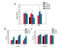 | Fig. 2. Blood biochemical results of the CDs treated mice after 1 day, 7 days and 28 days. These results showed the mean and standard deviation of (a) white blood cells (WBC) (b) alanine aminotransferase (ALT), (c) aspartate aminotransferase (AST), * P < 0.05. | |