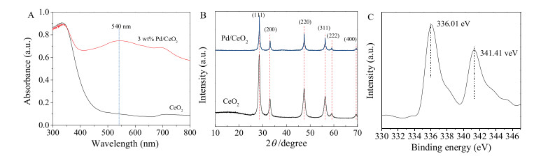 | Fig. 2. (A) UV–vis spectra of pure CeO2 (black), 3wt% Pd/CeO2 (red). (B) The X-ray diffraction patterns for pure 3wt% Pd/CeO2 (blue) and CeO2 (black). (C) X-ray photoelectron spectra (XPS) of 3 wt% Pd/CeO2. | |