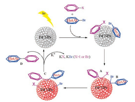 A plausible mechanism of the photocatalytic cross-coupling is illustrated in Fig. 3. Under the visible light irradiation, the concentrated energetic electrons can transfer to the halogen atom from the Pd atoms to facilitate the cleavage of C—X bonds to form an Ar—Pd—X complex A and Het-Pd-Br complex B. Next, the intermediates Ar-Pd-Het C generates in situ from the complexs A and B on the surface of Pd NPs. The final product D can be achieved by reductive elimination, and the Pd active sites can be returned to the initial states.