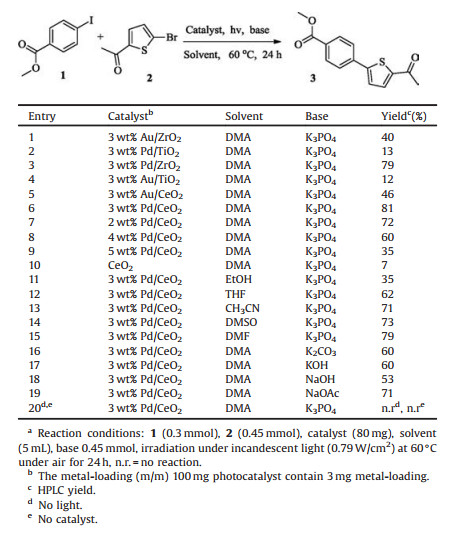 Initial investigation was conducted by employing reacts 1 with 2 in the presence of 3 wt% Pd/CeO2 as a photoredox catalyst, K3PO4 as the base and DMA as the solvent under the irradiation of an incandescent light (0.79 W/cm2) (with a glass filters to cut off the irradiation below a certain value of wavelength) at 60 ℃ for 24h, resulting in 81% yield of the target product 3 (Table 1, entry 6). As shown in Table 1, the application of 2 wt% and 4 wt% Pd provided 72% and 60% yield respectively (Table 1, entries 7, 8), and 5 wt% Pd gave only a small amount (Table 1, entry 9). Pd NPs is nanoparticles of nonplasmonic transition metals, we then turn to choose 3 wt% Au/ZrO2, which has been well demonstrated to have localized surface plasmon resonance (LSPR) [13, 14], but it only give a 40% yield of the target product (Table 1, entry 1). Then we screen kinds of other photocatalysts (Table 1, entries 2–5), when 3 wt% Pd/TiO2 and Au/TiO2 were used as the photoredox catalyst, we achieved quite low yields, 13%, 12% respectively (Table 1, entries 2 and 4). The use of Pd/ZrO2 or Au/CeO2 as the photoredox catalyst has no improvement in the transformation (Table 1, entries 3 and 5). The use of CeO2 as a catalyst led to a 7% yield of product, this result shows that the CeO2 support itself has a very limited contribution to the catalytic activity of the photocatalyst (Table 1, entry 10). Then, different solvents were also evaluated for this conversion (Table 1, entries 11–15), and those prove DMA was facilitated the reaction effectively. In order to improve the yield of the target product, different bases were tested, including K2CO3, KOAc, KOH, Na2CO3 and NaOAc. The results promoted us to use K3PO4 to conduct this reaction (Table 1, entries 16–19). It is important to note that visible light and catalyst are essential in the reaction (Table 1, entry 20).