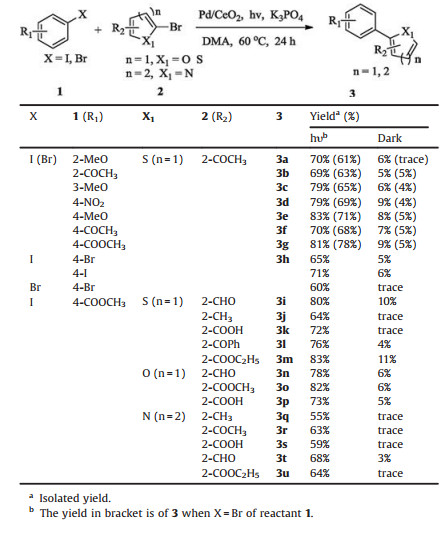In summary, we have developed a novel and environmental benign process for the synthesis of asymmetrical heterobiaryls through cross-coupling by using the visible-light-mediated catalyst Pd/CeO2. In contrast to previous work, the tolerances of substrates are good. Moreover, further studies on the application of recycle photochemical based on earth abundant metals for other organic transformations in progress in our laboratory