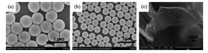 | Fig. 1. SEM images: (a) PS particles; (b) PMMA particles; (c) GO. | |