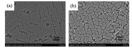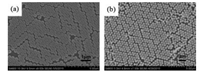 | Fig. 2. SEM images: (a) Sample A: 2D CCA of PS particles with diameters of 540nm; (b) Sample C: 2D CCA of PMMA particles with diameters of 460nm. | |