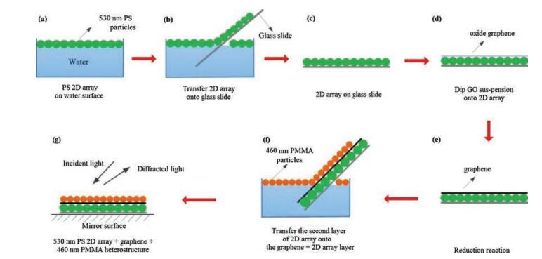 Zhang et al. used an air/waterinterface self-assemblymethod to fabricate 2D polystyrene (PS) colloidal array [20]. Xue et al. modified the above method and prepared an 2D colloidal crystal heterostructure based on different colloidal monolayer [21]. Herein, we introduced a layer-by-layer heterostructure fabricated from2D CCA and RGO, inwhich 2D CCAwere prepared byair/water interface self-assembly method, and the RGO layer was fabricated by GO suspension and reduction. The process can be repeated to obtain the desiredlayers of composite.The theoretical studyshows that the graphene-photonic crystal can increase the absorption of THz [22] and graphene in the infrared, facilitating enhanced performance of modulators, filters, sensors, and photodetectors [23]. The layer-by-layer heterostructure composite showed promising potential for the applications as sensors and optoelectronic devices. The preparation process is as follows.