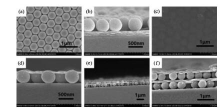 Next, 2D colloidal monolayer was prepared by gas-liquid interface self-assembly method. An aqueous alcohol-containing colloidal particle suspension could be rapidly assembled into a hexagonal closely-packed 2D CCA at the air/water interface [16]. Zhang et al. reported the self-assembly of PS nanoparticles on a water surface using PS suspension in a water/1-propanol solvent [19]. Xue et al. prepared 2D PMMA CCA employing 3:1 ratio of PMMA particle suspension (0.15g/mL) to propanol [21]. When the colloidal suspension in propanol was laid on the water surface, colloidal particles quickly spread from the sampling spot to the out edge of the water surface due to the Marangoni effect, inwhich the surface tension gradient on the water surface pushes the colloidal suspension away from the sampling spot. As the colloids spread outwards, they self-assembled rapidly into a hexagonal closepacked 2D monolayer array. The 2D arraycould be transferred onto a glass slide as shown in Fig. 3b. A perfect continuous 2D colloidal monolayer array could be fabricated within 2min. In this study, PS particles of 540nm and PMMA particles of 460nmwere selectedto form the high ordering of corresponding hexagonal 2D monolayer arrays, which were confirmed by their SEM images (Figs. 2a and b).
