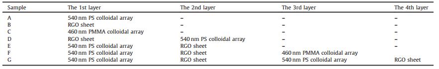 With the 2D colloidal monolayer and RGO monolayer, the layerby-layer heterostructure composite was prepared. The compositions of the PhC-RGO composites were listed in Table 1. The fabrication process of sample A and C was schematically demonstrated in Figs. 3a–c, that of sample E was shown in Fig. 3e, and that of sample F was shown in Fig. 3g, sample E was obtained by repeating the fabrication process of sample G twice.