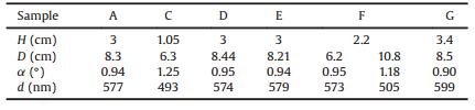 Therefore, the 2D array particle spacing could be determined simply by measuring the diameter D of Debye ring. The Debye diffraction rings of sample A, C and F were shown in Fig. 5. The parameters of Eq. (1) from the diameter of Debye diffraction rings were listed in Table 2. It can be observed that the diameter of Debye ring decreased with the increasing of particle size in the 2D CCA. The corresponding particle spacing of sample A and C, calculated from Eq. (1), were 577 and 493 nm respectively. The difference between the calculated and measured particle spacing might be explained that the particles were not closely packed, which was confirmed in SEM images (Fig. 2).