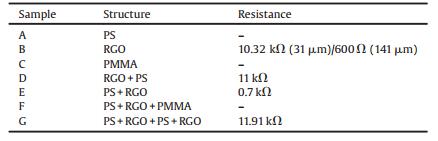 The electrical resistance of the layer-by-layer heterostructure composite was measured to characterize the electrical properties. The electrical conductivities of the samples were measured by using a four-probe conductivity tester (SZT-2A instrument, China) at room temperature. The electrical resistance of the samples were listed in Table 3. Graphite oxide and pure graphene have resistance of 88.5Ω and 0.69Ω reported [27]. Previous work showed that graphite oxide was almost insulating [28], but the possible incomplete oxidation of the graphite may result in the high conductivity of the prepared graphite oxide, and the resistance of sample B confirmed this assumption. The electrical conductivity depends on the thickness of RGO sheet, meanwhile in order to obtain RGO sheet with different thickness, the concentration of GO suspension was adjusted accordingly. Sample A, D and F were insulative, meanwhile Sample C, E and G were electrical conductive. The large surface area and high ratio of the RGO prepared via chemical reduction played an important role in the improvements of electrical conductivity of the layer-by-layer heterostructure composite based on RGO and 2D.Compared with the single CCA, the heterostructure composite has more excellent electronical performances.