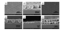 | Fig. 4. SEM images: (a) top-view of sample D; (b) cross-section of sample D; (c) topview of sample E; (d) cross-section of sample E; (e) cross-section of sample F; (f) cross-section of sample G. | |