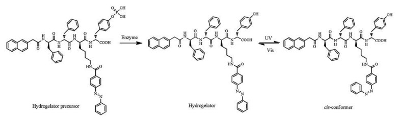 | Fig. 4. Chemical structures of side chain AZO-modified enzymatic hydrogelator precursor and hydrogelator. | |