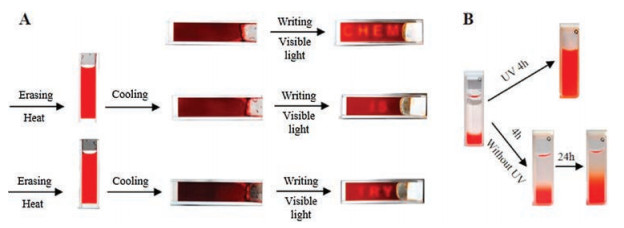 | Fig. 9. (A) MC1-Arg-Gly-Asp hydrogel is employed as an erasable photolithograph Material. (B) Controlled release of vitamin B12 from hydrogel trans-AZO-Gln-Phe-Ala through UV irradiation compared with spontaneous diffusion. Reproduced with permission [24, 26]. Copyright 2011 and 2015, The Royal Society of Chemistry. | |