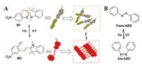 | Fig. 2. (A) The reversible transformation between SP isomer and MC isomer upon photo-irradiation and the self-assembly of MC isomers. Reproduced with permission [24]. Copyright 2015, The Royal Society of Chemistry. (B) The reversible transformation between trans/cis AZO upon photo-irradiation. | |