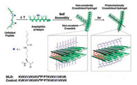 Photo-crosslinking peptide hydrogels were utilized for hydrogel mechanical property strengthening. The peptide hydrogelators containing photo-crosslinking groups were able to self-assemble forming physical hydrogels. Upon light illumination, crosslinking reaction between hydrogelators produces hydrogels with hybrid physical-covalent network and thus enhanced mechanical property (Fig. 1D). Still in Schneider group, they reported a photocrosslinking peptide hydrogelator which is a de novo designed β-hairpin peptide equipping photo-crosslinkable dienes [38]. The 22-residue peptide named MLD is capable of folding intramolecularly and self-assembling by increasing the temperature and ionic intensity, to afford β-sheet fibrils causing hydrogelation. By UV irradiation, dienes of non-natural sorbamide derivatives on lysine polymerize along the surface of the gel, which can enhance the gel's material rigidity with a 2.5-fold increase without losing the secondary structure in-situ (Fig. 8). This kind of novel hydrogel allows the manipulation of mechanical properties after the gel has been delivered. Afterwards, same reinforcing of mechanical properties on established hydrogels were achieved by Wang [39] and Parquette [40] groups, respectively using photo induced Ru(bpy)3Cl2-catalyzed tyrosine cross-linking reaction and dimerization of coumarin groups.