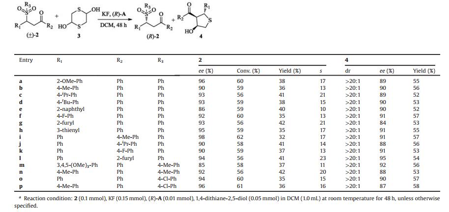 Under the optimal reaction conditions (Table 1, entry 3), the generality of this one-pot protocol was investigated. As summarized in Table 2, the reaction with a series of β-sulfonyl ketones (rac-2a–2f, 2i–2k) bearing electron-rich or electron-deficient substitutes on aromatic ring at R1 or R2 position proceeded smoothly to afford the unreacted sulfones ((R)-2a–2f, 2i–2k) with high enantioselectivityand satisfactory s factors and trisubstituted tetrahydrothiophenes (4a–4f, 4i–4k) were formed in high enantioselectivity and diastereoselectivity. Heteroaryl substrates (rac-2g, 2h, 2l) were well tolerated under the catalytic system. Additionally, the substrates with different functional groups on the sulfone at R3 position (rac-2m–2p)provedtobegoodsubstratesfor this reaction.