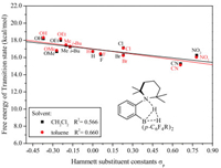 | Fig. 7. The relationship between Hammett substituent constants and free energy barrier of FLPs catalyzed H2 activation in two different solvents. | |