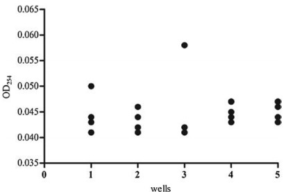 | Fig. 2. The optimal densities of the mimic mixtures of the 3 components with 5 different ratios. The dot represents one experiment. The figure shows the result of 3 replicates. 96-well plate represents a cost-effective method to replace the HPLCbased characterization of the yield of sterol derivatives. | |