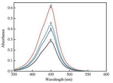 The feasibility of this proposed strategy was performed first and the results were shown in Fig. 2. Without the assembled products, the UV–vis absorbance intensity was weak (Fig. 2, curve a). The sensing system exhibited strong absorbance when only the products of the assembly proteins (Fig. 2, curve b) or DNA (Fig. 2, curve c) involved. Additionally, a stronger absorbance peak appeared when the assembly of DNA and protein (Fig. 2, curve d) were both present.