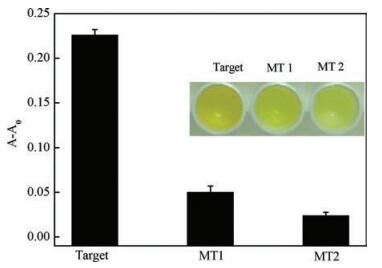 | Fig. 4. Selectivity of this system for complementary target DNA (Target) compared to single-base mismatched target (MT1) and two-base mismatched target (MT2). Inset: color responses of this sensing system in the presence of 25 pmol/L complementary target DNA, single-base mismatched target, two-base mismatched target. | |