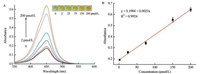 | Fig. 3. (A) UV–vis absorption spectra of this system in response to different concentrations of THIV. Inset: color responses of this system with different concentrations of THIV. (B) The linear relationship between the UV–vis absorbance intensity and the concentration of the target DNA. | |