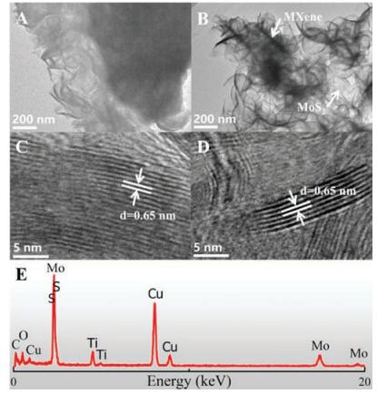 | Fig. 2. TEM images of (A) MoS2 and (B) MoS2/Ti3C2. HRTEM images of (C) MoS2 and (D) MoS2/Ti3C2. (E) EDX of MoS2/Ti3C2 composite in (B), the presence of Cu is attributed to the microgrids for supporting samples. | |