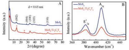 | Fig. 3. XRD pattern (A) and Raman spectra (B) of MoS2 and MoS2/Ti3C2. | |