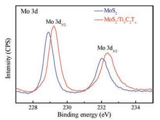 | Fig. 4. XPS of Mo 3d of MoS2 and MoS2/Ti3C2Tx composite. | |