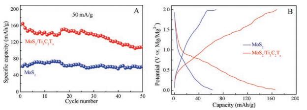 For H-MXene electrode, negligible capacity was displayed in magnesium battery (Fig. S4 in Supporting information). Fig. 5A showed the cycling performance of MoS2 and MoS2/Ti3C2Tx composite at 50mA/g. Pure MoS2 delivered a capacity of only 62mAh/g. MoS2/Ti3C2Tx composite achieved a higher capacity of 165 mAh/g and maintained a discharge capacity of 108 mAh/g after 50 cycles. The obtained capacities are higher than other reported MoS2–based materials [16, 21, 22]. The significant increase of magnesium ions storage capacity after incorporating MXene could be ascribed to the open structure with few-layer MoS2 nanosheets and high conductivity of MXene, which offers more paths and active sites for Mg2+ insertion/extraction.