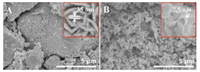 | Fig. 1. FESEM images of MoS2 (A) and MoS2/Ti3C2Tx composite (B). The inserts show the corresponding magnifications. | |