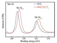 The Mo 3d X-ray photoelectron (XPS) spectra of MoS2 and MoS2/Ti3C2Tx composite were compared in Fig. 4. The two peaks at 228.9eV and 232.0 eV were the doublet Mo 3d5/2 and Mo 3d3/2 of Mo4+. However, the peaks of MoS2/Ti3C2Tx composite shifted to 229.2eV and 232.3eV, the binding energy increased by 0.3 eV. The increased binding energy after adding MXene indicates the improvement of electronegativity around Mo element. It demonstrated not just simple physical mixing but chemical bonding between MoS2 and MXene [21].