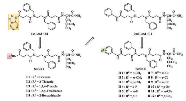 Natural ASTs are susceptible to inactivation in vivo as a consequence of hydrolysis by hemolymph and poor penetration through the insects. The primarily hydrolytic site of the core pentapeptide between the residues Y/F-X and the other hydrolytic site such as G-L was also detected [6]. Analogs with modification and replacement of amino acids at the hydrolysis not only showed resistance to peptidases but also retained their bioactivities. In our previous study [11], analog B1, a new mimic for Y/FXFGL in which Y was replaced with 4-(1H-benzo[d][1,2,3]triazol-1-yl)-4-oxobutanoic acid, showed good inhibition activity without hydrolytic site. To find new analogs with higher bioactivity and lower cost, further optimization on B1 was carried out in present work. As shown in Fig. 1, the first step of the strategy was to replace the N-terminus 1H-benzotriazole with aniline and heterocyclic amines (Series I). The bioassay result indicated that analog I1 with N-terminus containing benzene showed the best activity. We subsequently selected I1 as the second lead, and a series of analogs Series II) with different substituents on benzene at the N-terminus were designed and synthesized to explore the substituent effect on the benzene ring.