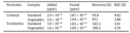 The detection of pesticides residues on standard pesticide solution by AChE-NH2-SBA-15 was conducted 7 times for the same sample, and 3 times on real vegetable sample for the calculation of relative standard deviation (RSD), respectively. It can be seen from Table 2, the current method showed good recovery (93.8%-109.3%) and low RSD (< 5%). Therefore, this proposed immobilized AChE can be regarded as a promising reagent for pesticide residues detection of real samples.