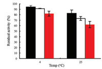 Fig. 1. The residual activity of different immobilized AChE stored at 4 ℃ and 25 ℃