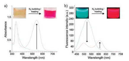 | Fig. 10. (a) UV-vis absorption and (b) fluorescence emission (λex = 430 nm) spectra of Nile red and probe 7 coexisting in the DBU/1-propanol mixture (5.0 ×10-5 mol/L) before and after injection of an excess amount of CO2. Insets: Photographs of the solution under (a) ambient light and (b) UV light (λex > 365 nm). Dry ice was used as the CO2 source for experimental convenience. Reproduced with permission [56]. Copyright 2016, Elsevier Ltd. | |