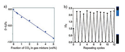 | Fig. 4. (a) Plots of emission intensities ((I-I0)/I0) of probe 2 versus fraction of CO2-air mixtures. (b) Maximum emission intensity change of 2 (100 μmol/L) in the THF/ H2O (1/9, v/v, 3 mL) mixture upon bubbling with 0.5 mL of carbon dioxide (bottom) and addition of 0.33 mmol/L NaOH (top) versus repeating cycles. Copied with permission [36]. Copyright 2015, Royal Society of Chemistry. | |