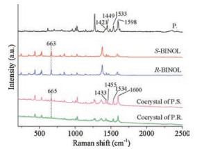 | Fig. 5. Raman spectroscopy for pure R-BINOL, S-BINOL, molecular P. and their co-crystal. | |