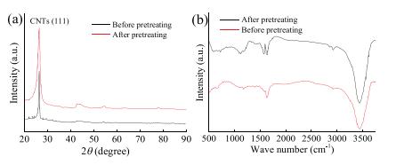 | Fig. 2. X-ray diffraction patterns and FTIR spectra of CNTs, (a) X-ray diffraction patterns of CNTs before and after pretreating, (b) FTIR spectra of CNTs before and after pretreating with a mixed acid. | |