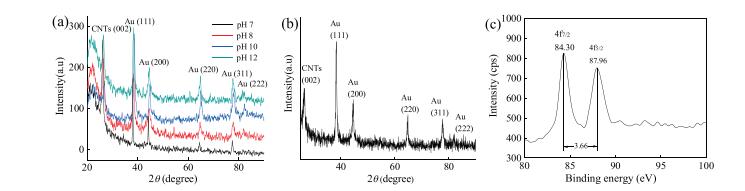 | Fig. 3. Effect of conditions on particle load. (a) XRD patterns of Au/CNTs as a function of pH, (b) XRD results of carbon nanotube loading on Au nanoparticles, (c) XPS patterns of Au/CNTs. | |