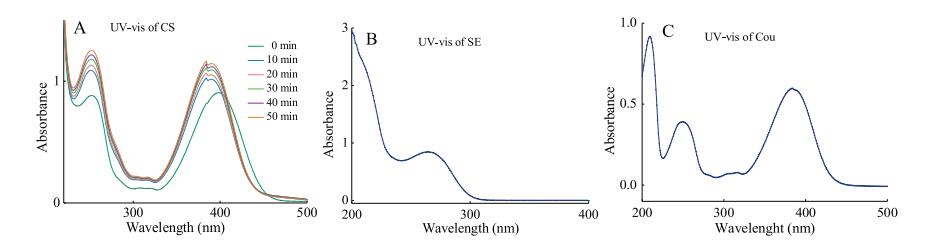 | Fig. 2. (A) UV–vis absorption of CS at regular intervals of irradiation in MeOH/H2O (50/50) (5.6 ×10-5 mol/L). (B) UV–vis absorption of SE. (C) UV–vis absorption of Cou. | |