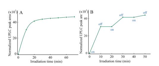 The time-dependent release of SE upon blue light irradiation was also studied by plotting UPLC peak area of SE versus differentirradiation times (Fig. 3). The photorelease approaches saturation at about 20 min and 100% SE was regenerated. By switching the light source on and off, the release process can be initiated or stopped, indicating that release of SE can only be induced by light.