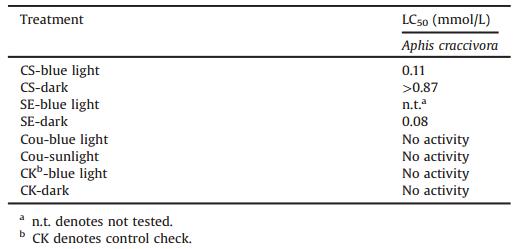 CS alone in the dark has low insecticidal activity with LC50 value more than 1 mmol/L. Upon irradiation, the activity increased significantly with LC50 approaching 0.11 mmol/L. No significant activity difference was observed for SE before and after irradiation. SE has higher activity than CS plus blue light. Light alone do not have any obvious activity to aphids. The above results indicated that efficient light-triggered release of SE was achieved using coumarin as a cage.