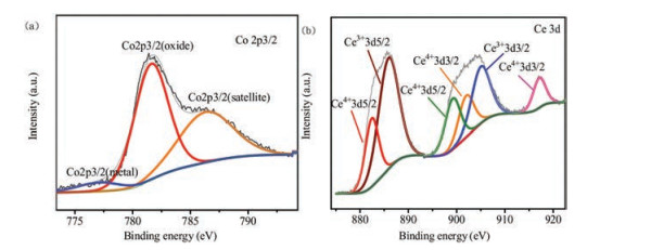 | Fig. 3. (a) The XPS spectra of (a) Co 2p3/2 and (b) Ce 3d for the Co-(CeOx)0.91/NGH. | |