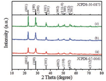 | Fig. 2. XRD patterns of the synthesized Nb2O5 samples: (a) TT-Nb2O5-500, (b) TTNb2O5-600, and (c) T-Nb2O5-700. | |