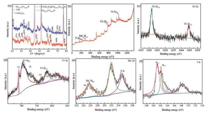 X-ray photoelectron spectroscopy (XPS) test is conducted to further analyze the surface chemical composition and chemical valence of different elements of the as-synthesized CoMo2S4@ ZnCo-S composites. Fig. 1b presents the XPS spectrum of CoMo2S4@Zn—Co—S composites. A full-survey-scan spectrum indicates the presence of Zn, Co, Mo, and S elements in the composites. Zn 2p spectrum is presented in Fig. 1c, in which two strong peaks at 1021.50 eV and 1044.50 eV correspond to the binding energy of Zn 2p3/2 and Zn 2p1/2, respectively, confirming the presence of Zn2+ in the composites. Fig. 1d shows the XPS spectrum of Co element, Co 2p spectrum could be decomposed into six components in the energy range of 772-810 eV. The peaks show low energy bands at 778.3 eV and 781.3 eV, which are assigned to the Co 2p3/2 and confirm the existence of a Co-S bond, The other double peaks at around 793.61 eV and 797.2 eV are related to the Co 2p1/2 from Co-O bond, which might originate from the surface oxidation in air [27]. Based on the wide peaks of Co 2p3/2 and Co 2p1/2, it is reasonable to assume that Co2+/Co3+ species co-existed in the composites. The XPS spectra of Mo 3d region (Fig. 1e) shows one distinct peak at the binding energy of 232.25 eV, corresponding to the Mo 3d3/2, which is attributed to Mo6+[28]. Fig. 1f shows the XPS spectrum of S element. Obviously, the composites are composed of Zn, S, Co and Mo elements.