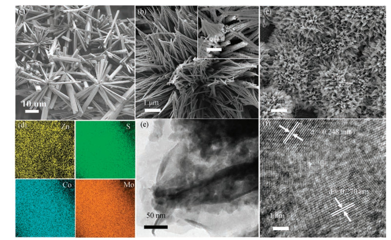 The morphology of the products are studied using SEM. Fig. 2a shows SEM image of the as-synthesized CoMo2S4 structure grown on Ni foam. Fig. 2b reveals hollow tubular morphology feature of Zn—Co—S and the outer diameter of the product ranges from between 30 nm and 50 nm. Fig. 2c exhibits high magnification SEM images of the as-synthesized product. Energy dispersive spectrometer (EDS) mappings (Fig. 2d) further prove the elemental composition of the composite material. The typical TEM image of the sample is shown in Fig. 2e. The outer shell structure with a thickness of 20 nm gives further evidence of the core-shell structure. HRTEM image in Fig. 2f indicates two distinct lattice spacings of 0.24 nm and 0.27 nm, which correspond to the (013) and (200) crystal plane of CoMo2S4 and Zn—Co—S sample, respectively.
