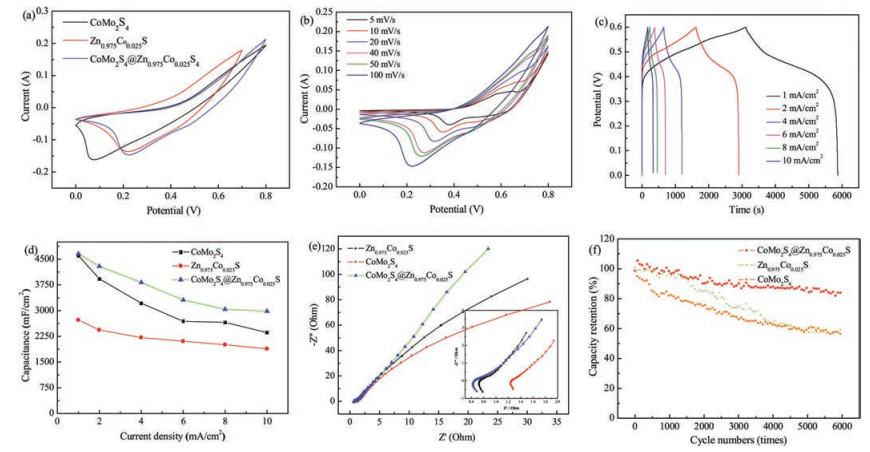 Herein, we reported a kind of novel CoMo2S4@Zn-Co-S nanostructures grown directly on Ni foam through a facile solution strategy. CoMo2S4 nanorods as the cores possess high capacity. However, the Zn—Co—S shells supply not only the effective path for electron transport but also additional capacity. Owning to the unique core-shell structures with more active sites, CoMo2S4@Zn—Co—S electrode materials present a high capacity of 4630 m F/cm2 at a current density of 1 mA/cm2 and good cycling stability with 85.6% capacity retention after 6000 cycles at current density of 10 mA/cm2. Furthermore, an asymmetric supercapacitor shows a volumetric energy density of 9.6 m Wh/cm3 at a volumetric power density of 235.471 m W/cm3. In the experiments, all of the reagents were analytical grade and used as purchased. Prior to the synthesis, a piece of Ni foam (3 × 3 cm2) was treated by immersed in 3 mol/L HCl solution for 30 min to remove the grease and oxidation film on the surface. Next, Ni foam was cleaned by sonication in ethanol and deionized water in sequence for 30 min and then dried for 12 h.