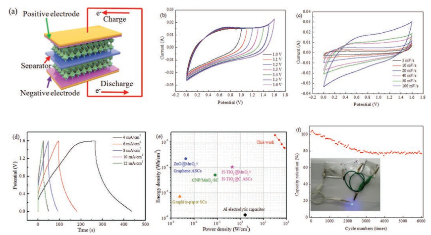 Based on CoMo2S4@Zn—Co—S composite as positive electrode) and ACs as negative electrode, an ASC is fabricated and its performance are shown in Fig. 4. Fig. 4a is schematic illustration of the as-assembled structure of CoMo2S4@Zn—Co—S //AC ASC. The CV curves for the CoMo2S4@Zn—Co—S//AC ASC at different voltage windows show that CoMo2S4@Zn—Co—S//AC ASC has a high operating cell voltage up to 1.6 V (Fig. 4b) and the curve is measured at the scan rate of 100 mV/s. Fig. 4c shows CV curves at different scan rates from 5 mV/s to 100 mV/s. With the sweep rate increasing, the shape of the curve remains unchanged, indicating the device possesses ideal capacitance performance. Fig. 4d indicates GCD curves at various current densities from 4 mA/cm2 to 12 mA/cm2. No obvious IR drop is observed in each discharge curve, implying the low internal resistance of the ASC [32]. In addition, all discharge curves are nearly symmetric to the corresponding charging counterparts, demonstrating the good electrochemical reversibility. The specific capacitance reaches a maximum of 0.84 C/cm2 at 4 mA/cm2. The energy densities and power densities of the as-prepared ASCs are shown in Fig. 4e. At a current density of 4 mA/cm2, the power density is 31.996 W/cm3 and the maximum energy density is 1.87 mWh/cm3. Compared with previously reported capacitive devices, the as-synthesized asymmetric supercapacitor exhibits superior electrochemical performance [33-37]. The long-term cycling stability of CoMo2S4@Zn—Co—S//AC ASC is examined by charge-discharge cycling at a current density of 10 mA/cm2. As shown in Fig. 4f, the capacitance retention of the ASC is 77% after 6000 cycles, which demonstrates excellent cycling stability. The inset in Fig. 4f shows the capacitor can light up a blue light. It can power a blue light indicator for 19 min (Fig. S3 in Supporting information), indicating its potential application in energy storage devices.
