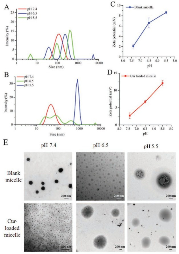| Fig. 2. Size distribution of (A) blank micelles and (B) Cur-loaded micelles at pH 7.4, 6.5, 5.5. Zeta potential of (C) blank micelles and (D) Cur-loaded micelles at pH 7.4, 6.5, 5.5. (E) TEM images of blank micelles and Cur-loaded micelles at pH 7.4, 6.5, 5.5 | |